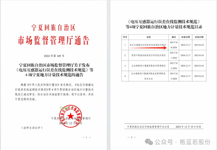 寧夏回族自治區(qū)地方監(jiān)測(cè)技術(shù)規(guī)范《電壓互感器運(yùn)行誤差在線(xiàn)監(jiān)測(cè)技術(shù)規(guī)范》,經(jīng)寧夏回族自治區(qū)市場(chǎng)監(jiān)管局批準(zhǔn)發(fā)布,自2025年1月1日起執(zhí)行。格藍(lán)若股份為主要參與起草單位。